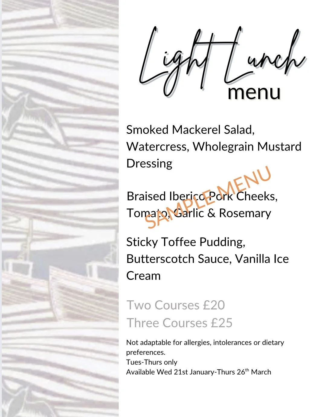 IF DINING WITH US & YOU ARE THINKING OF ORDERING THE LIGHT LUNCH & HAVE DIETARY REQUIREMENTS PLEASE CALL THE DAY BEFORE DINING TO SPEAK TO MEMBER OF STAFF TO DISCUSS SUITABILITY. YOU MAY NEED TO CANCEL & BOOK ANOTHER DAY IF NOT SUITABLE OR CHOOSE FROM THE A LA CARTE MENU.