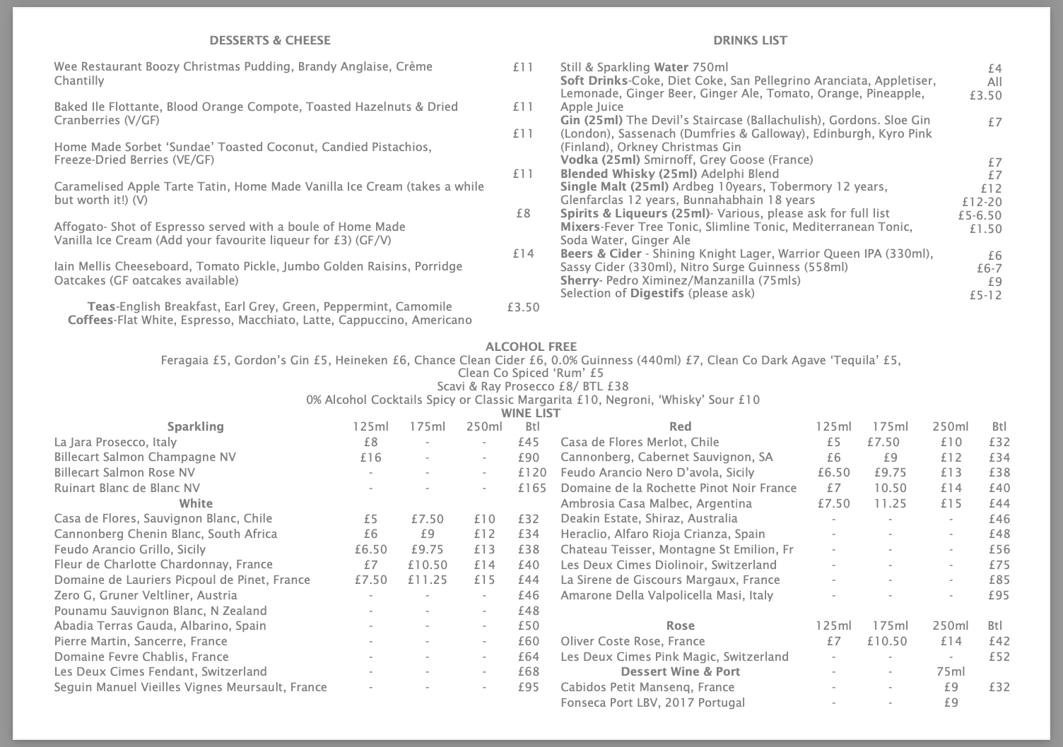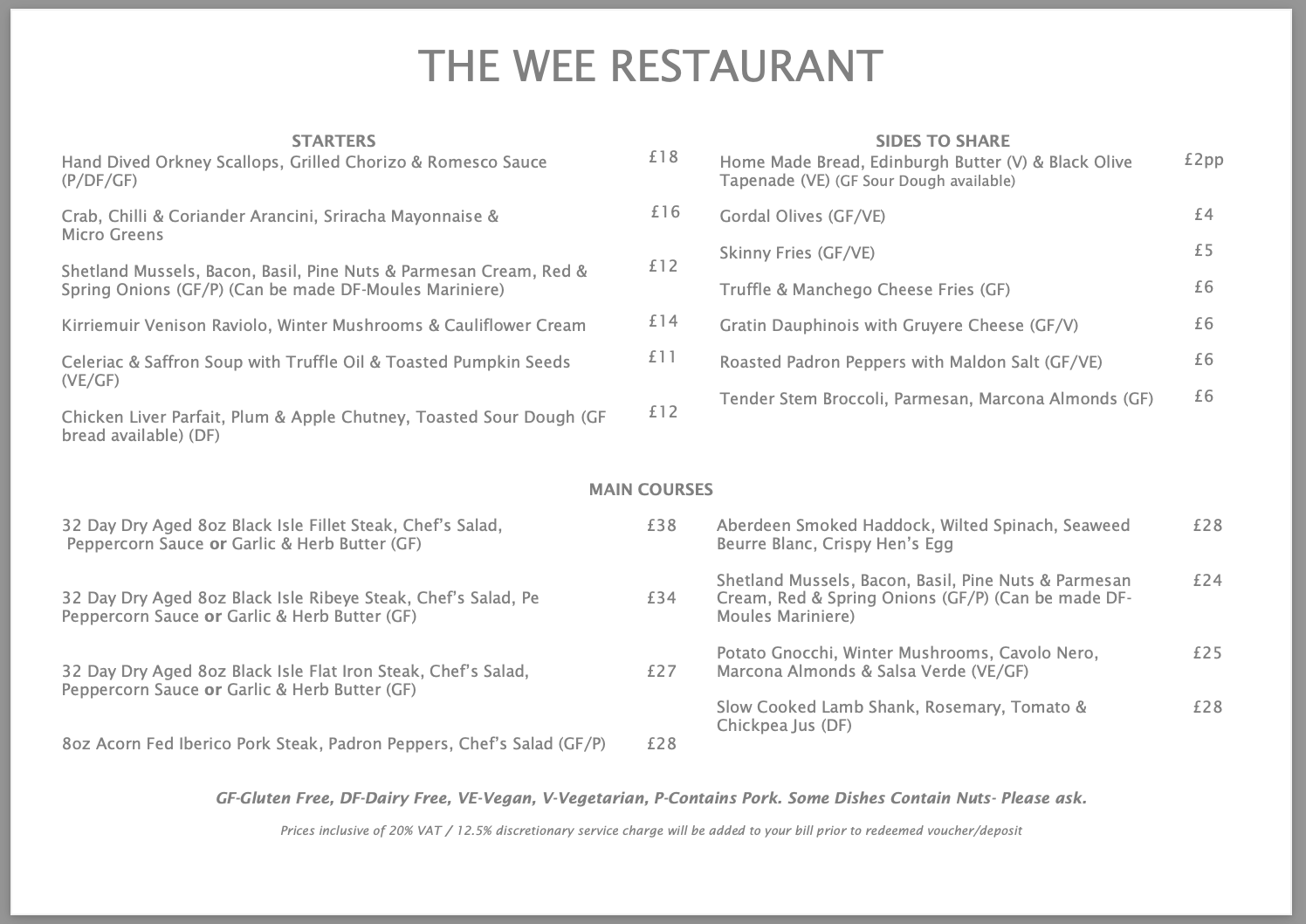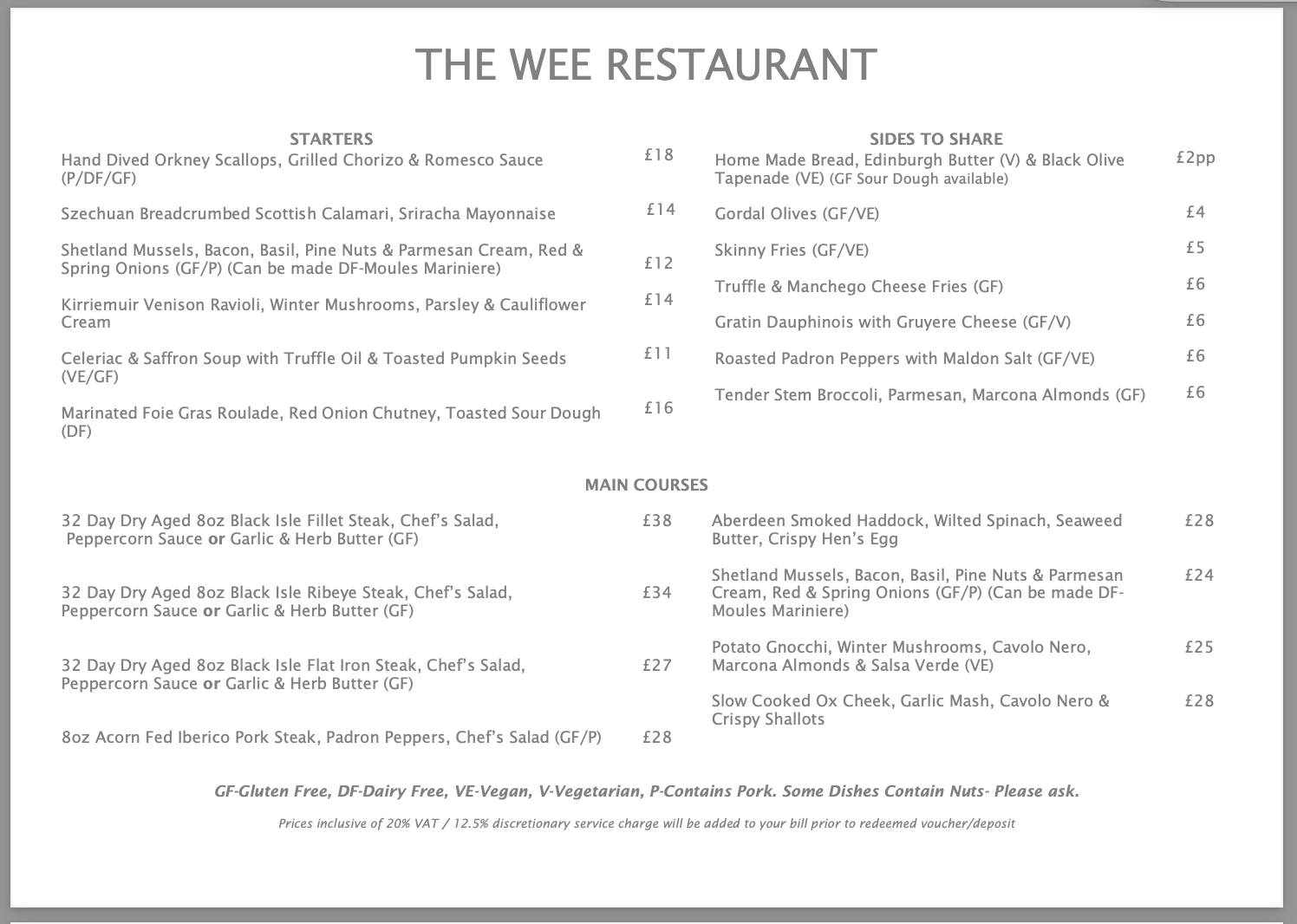 If you have any questions about the menu please email the restaurant prior to booking on fife@theweerestaurant.co.uk.